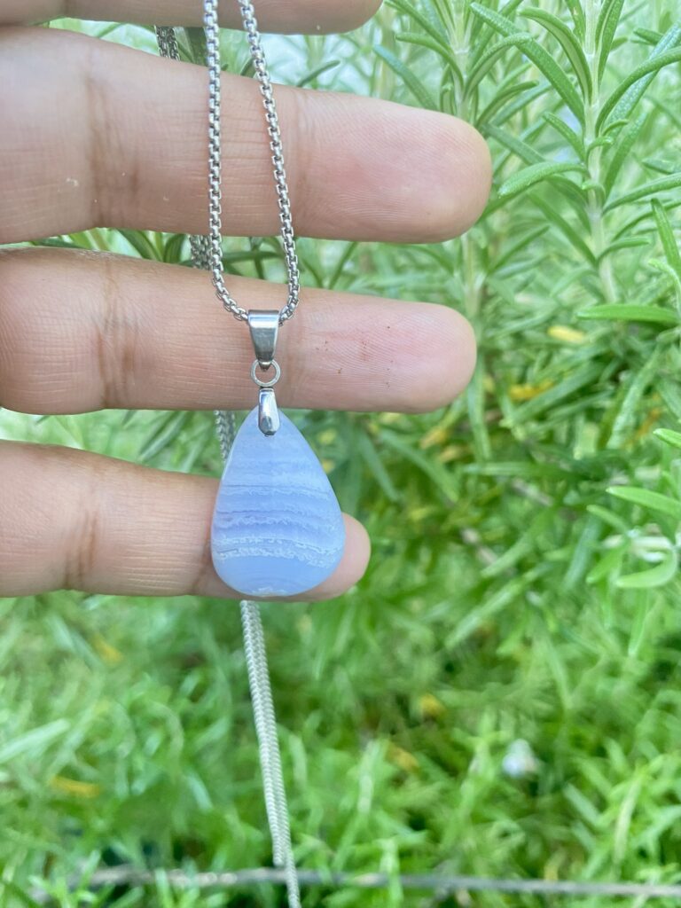 Joli pendentif en agate calcédoine bleue en forme de goutte.